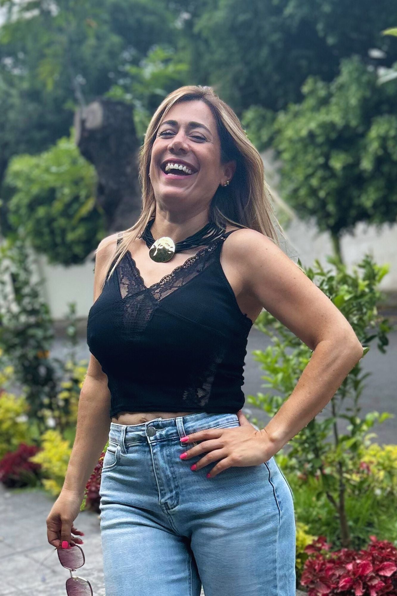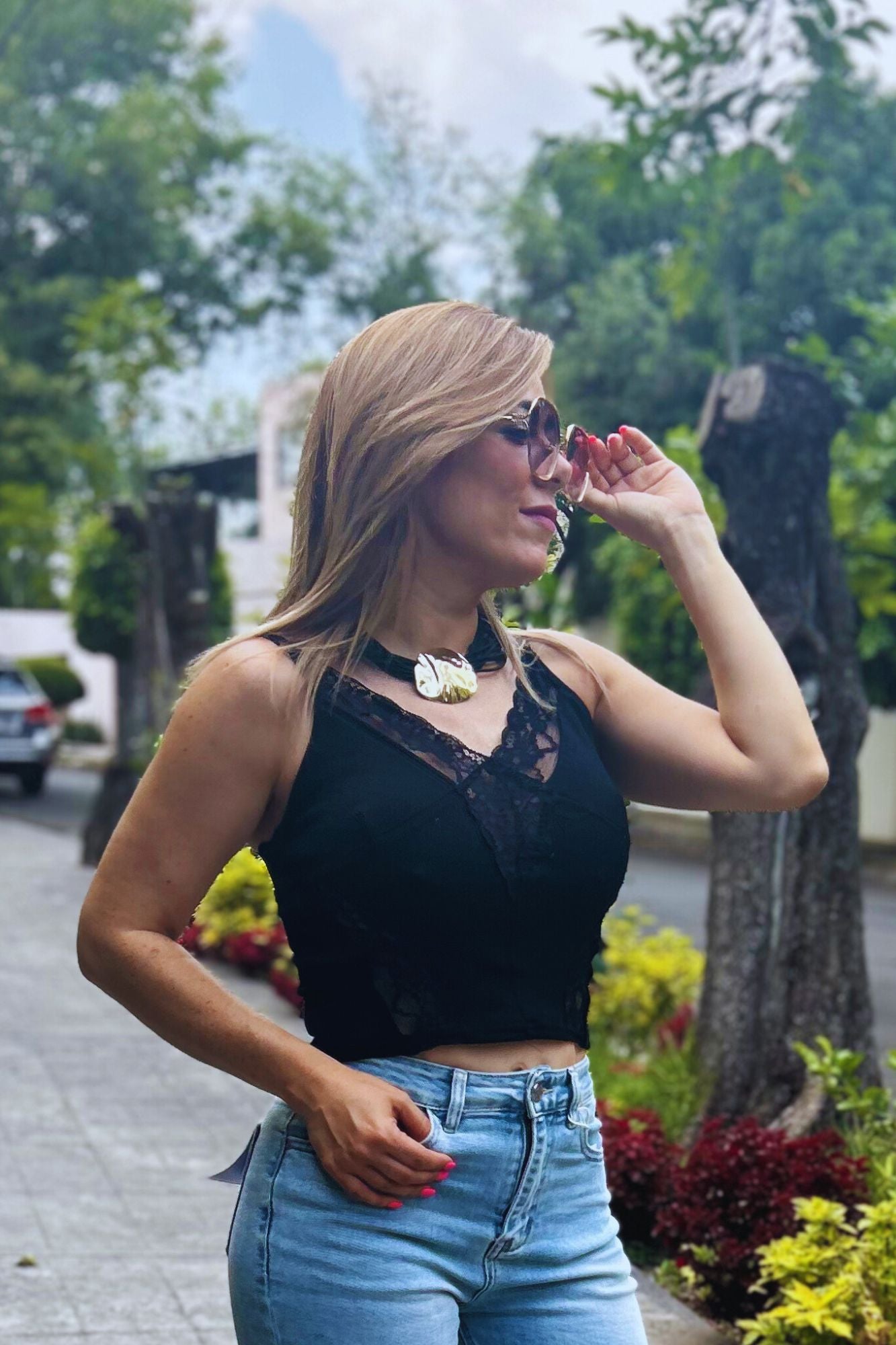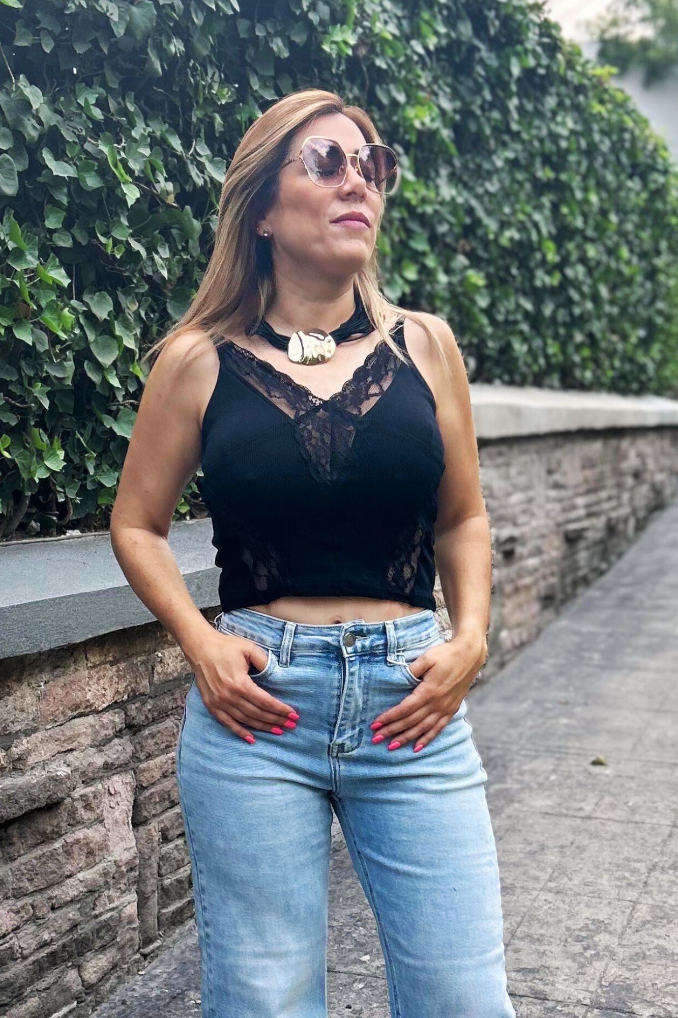 Blusa de tirantes ajustables negra con detalles de encaje y escote en v.