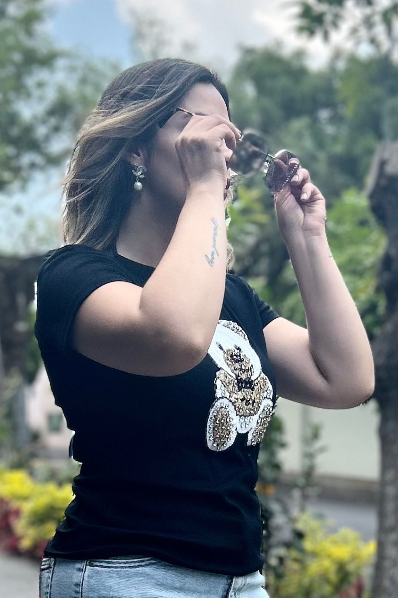 T-shirt negra con estampado de oso tipo crochet con pedrería.
