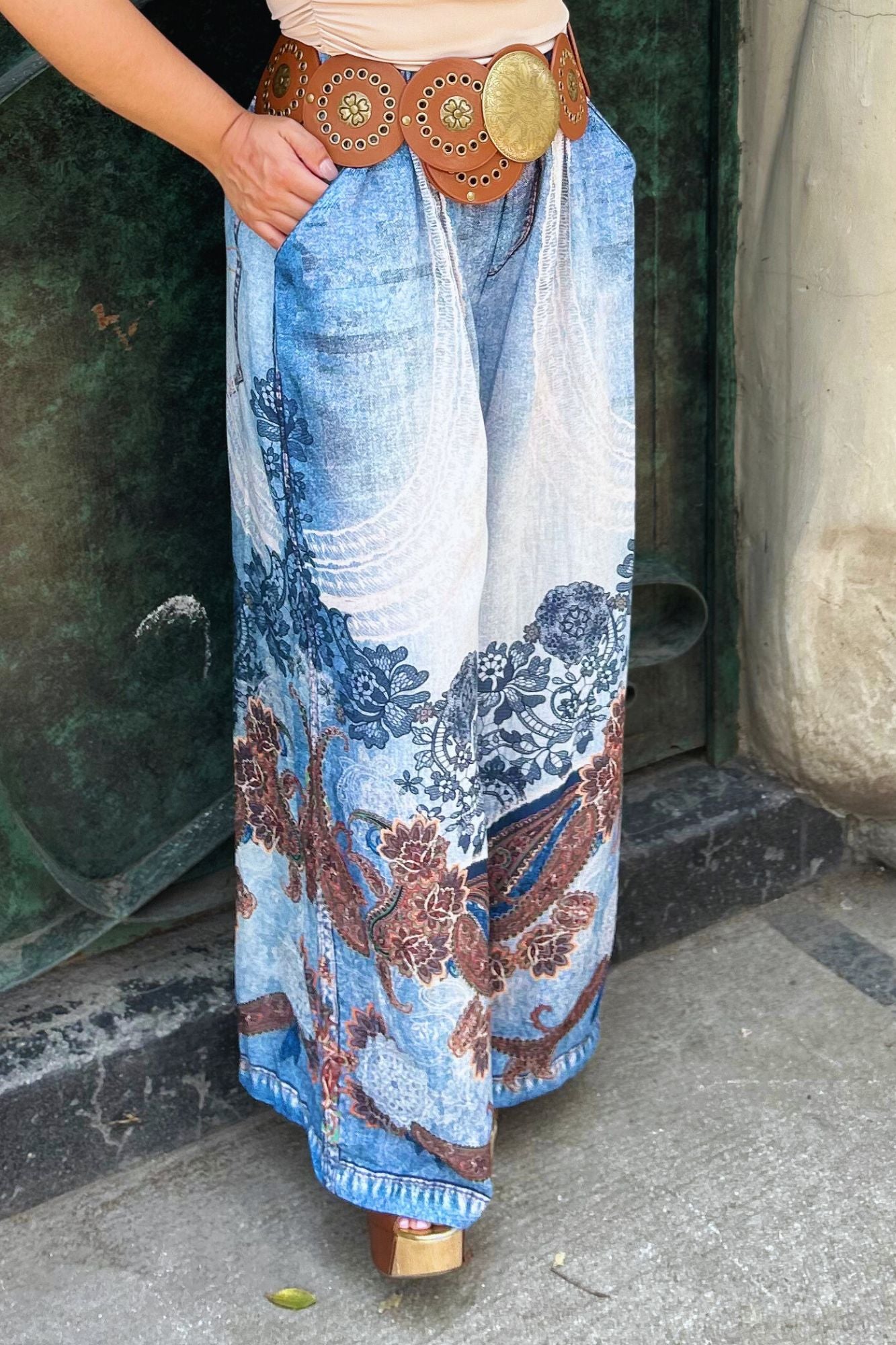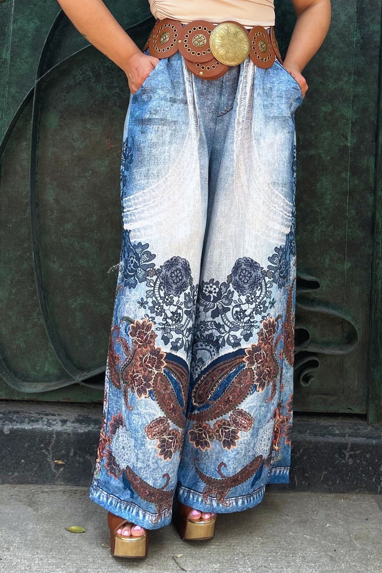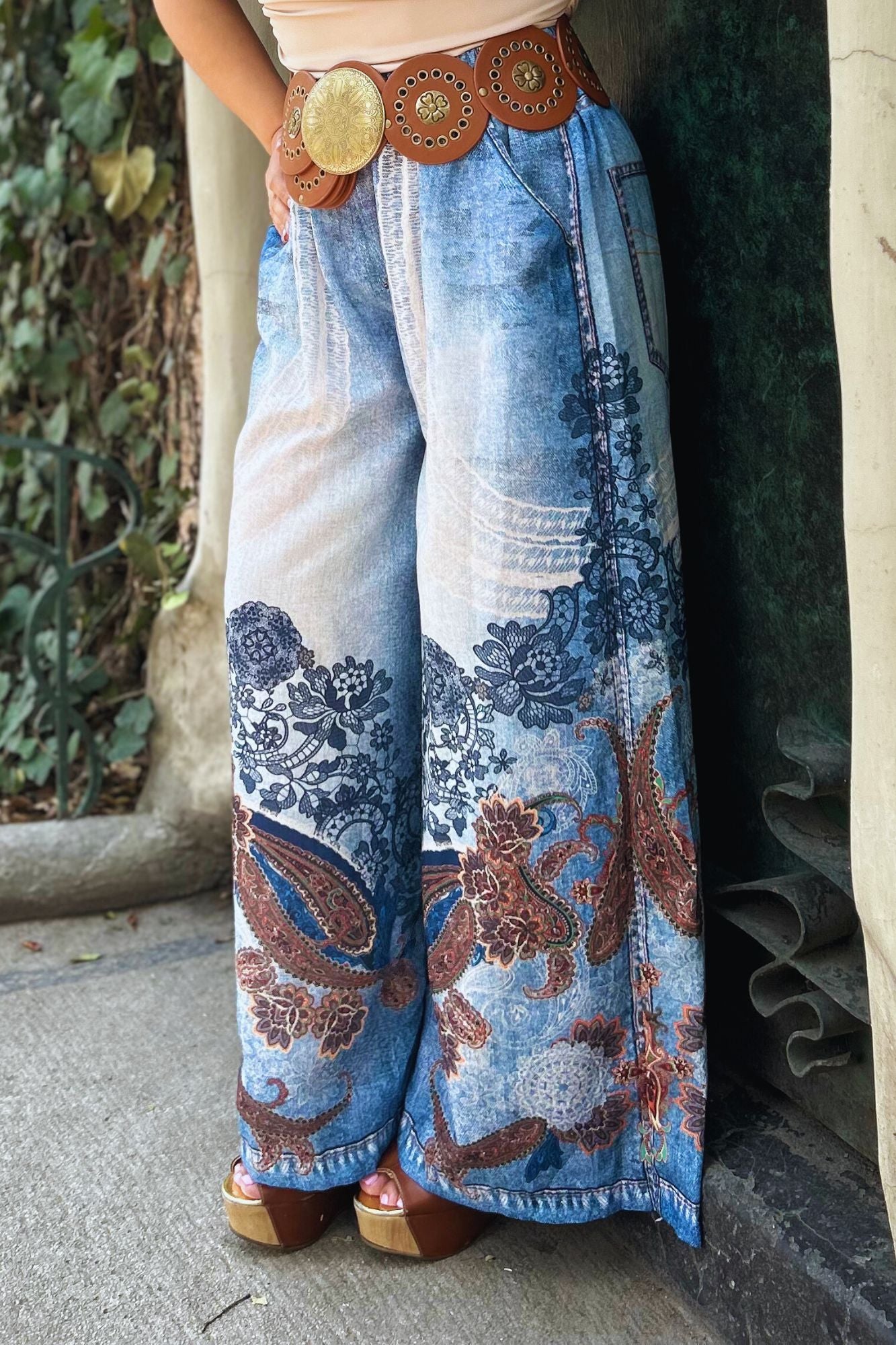 Pantalón tipo denim recto con elástico en la cintura y detalles de florituras en color cafe. Unitalla