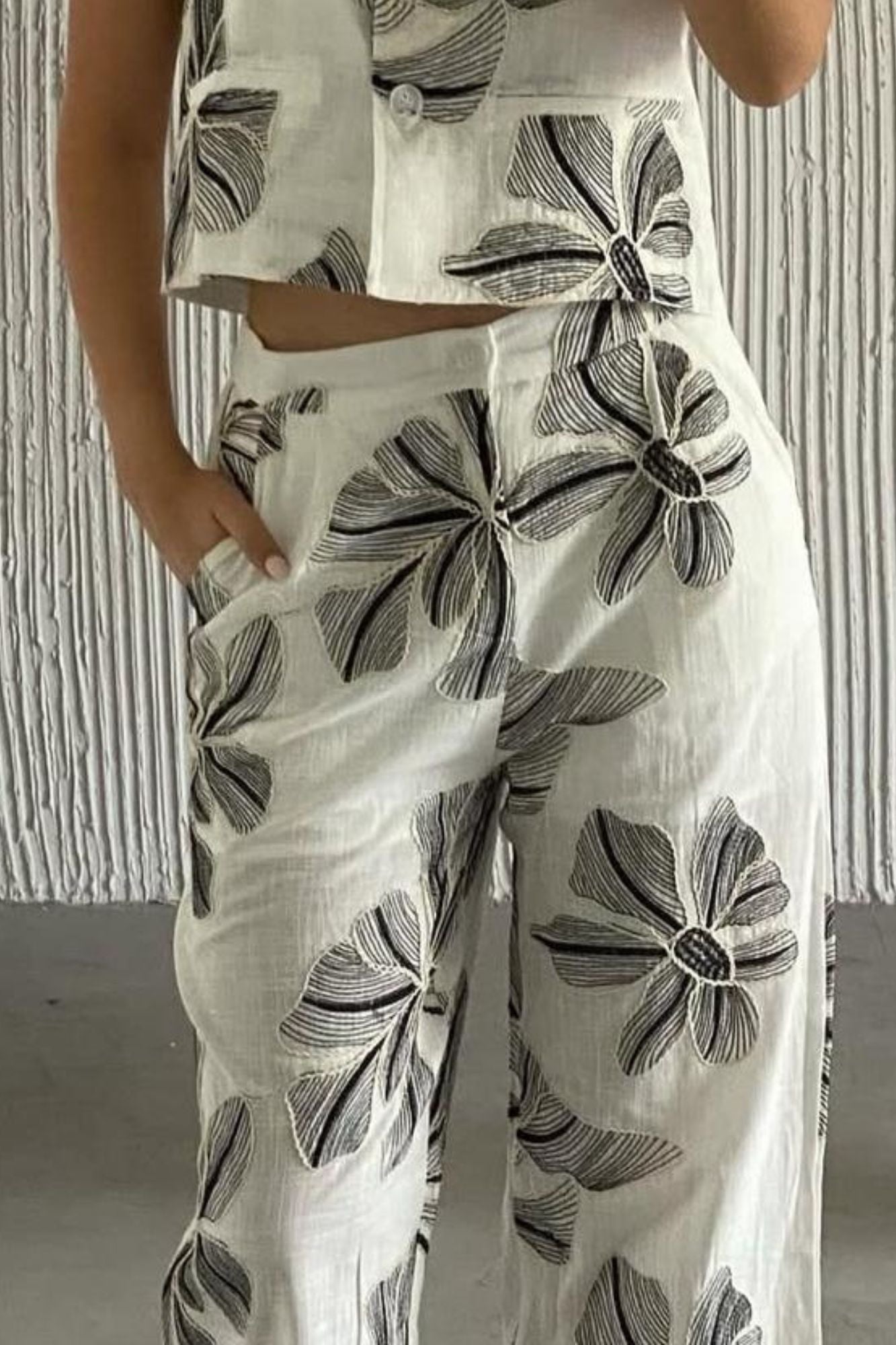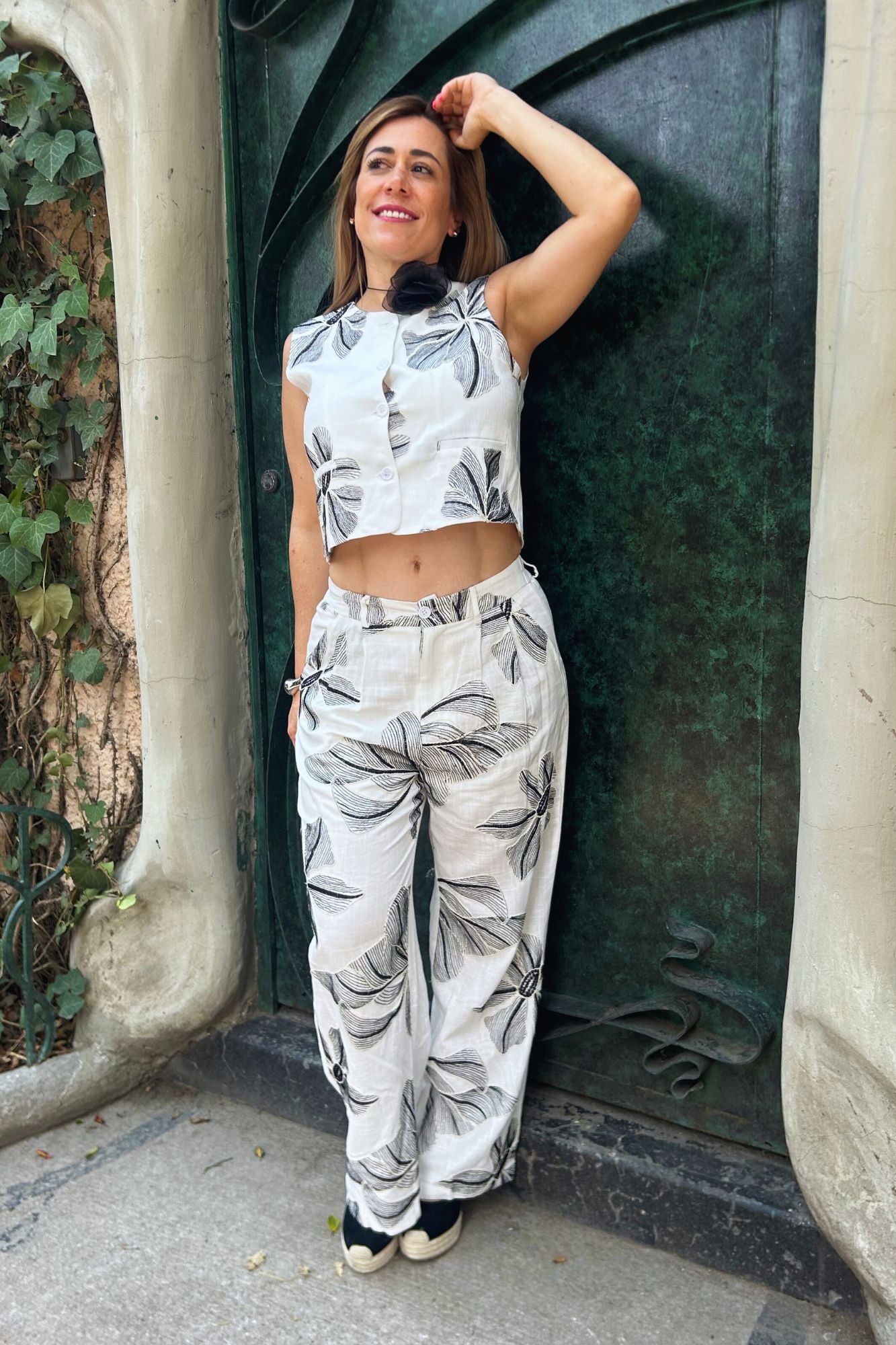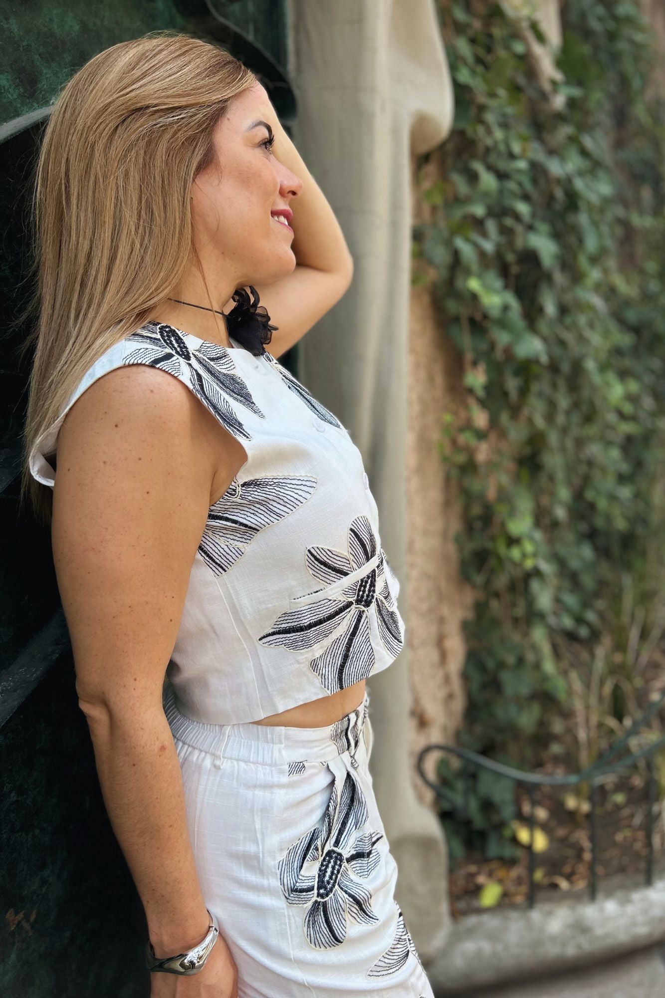 Set de pantalón y chaleco tipo lino color hueso con flores bordadas estilo marino en color negro.