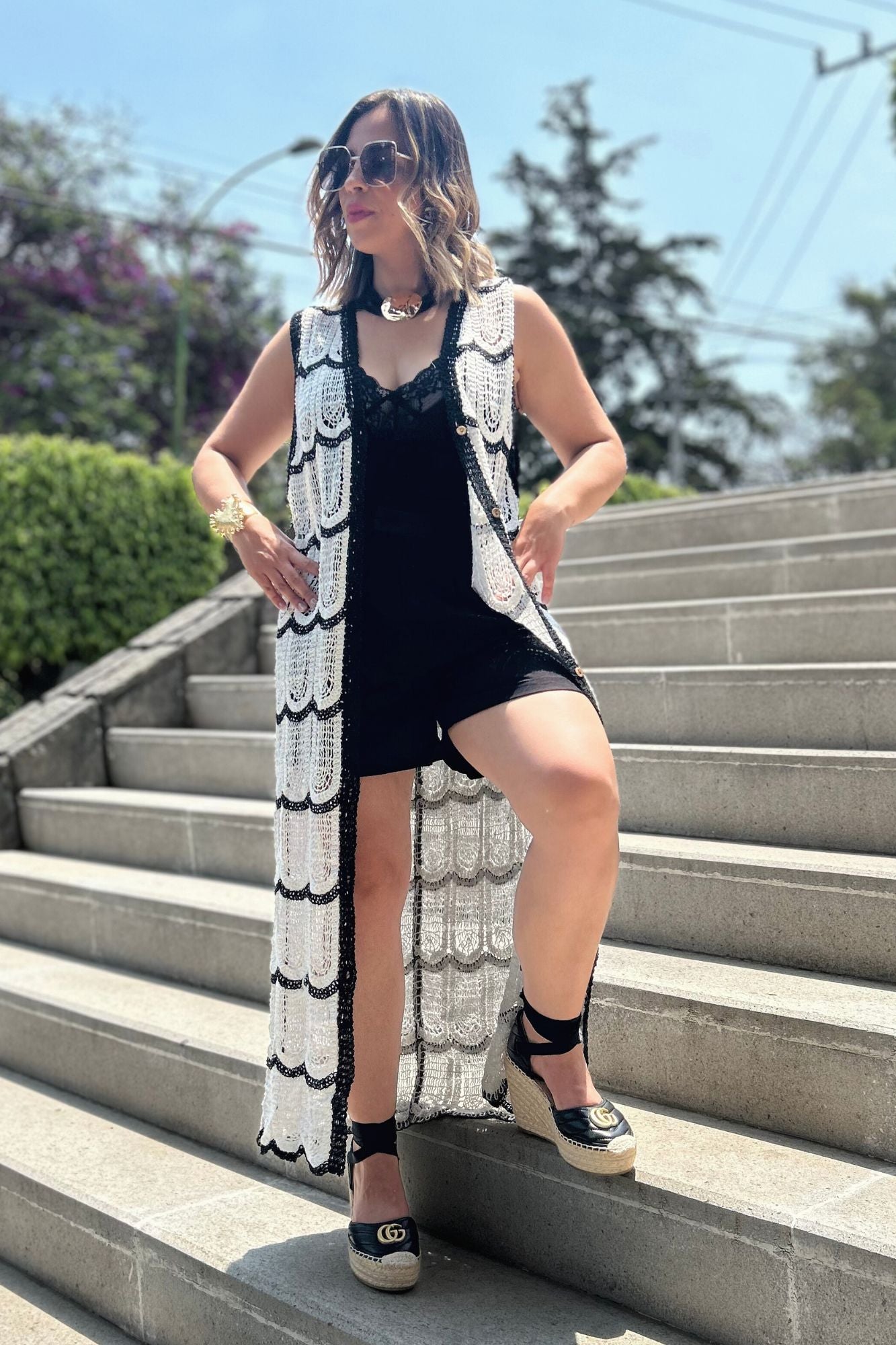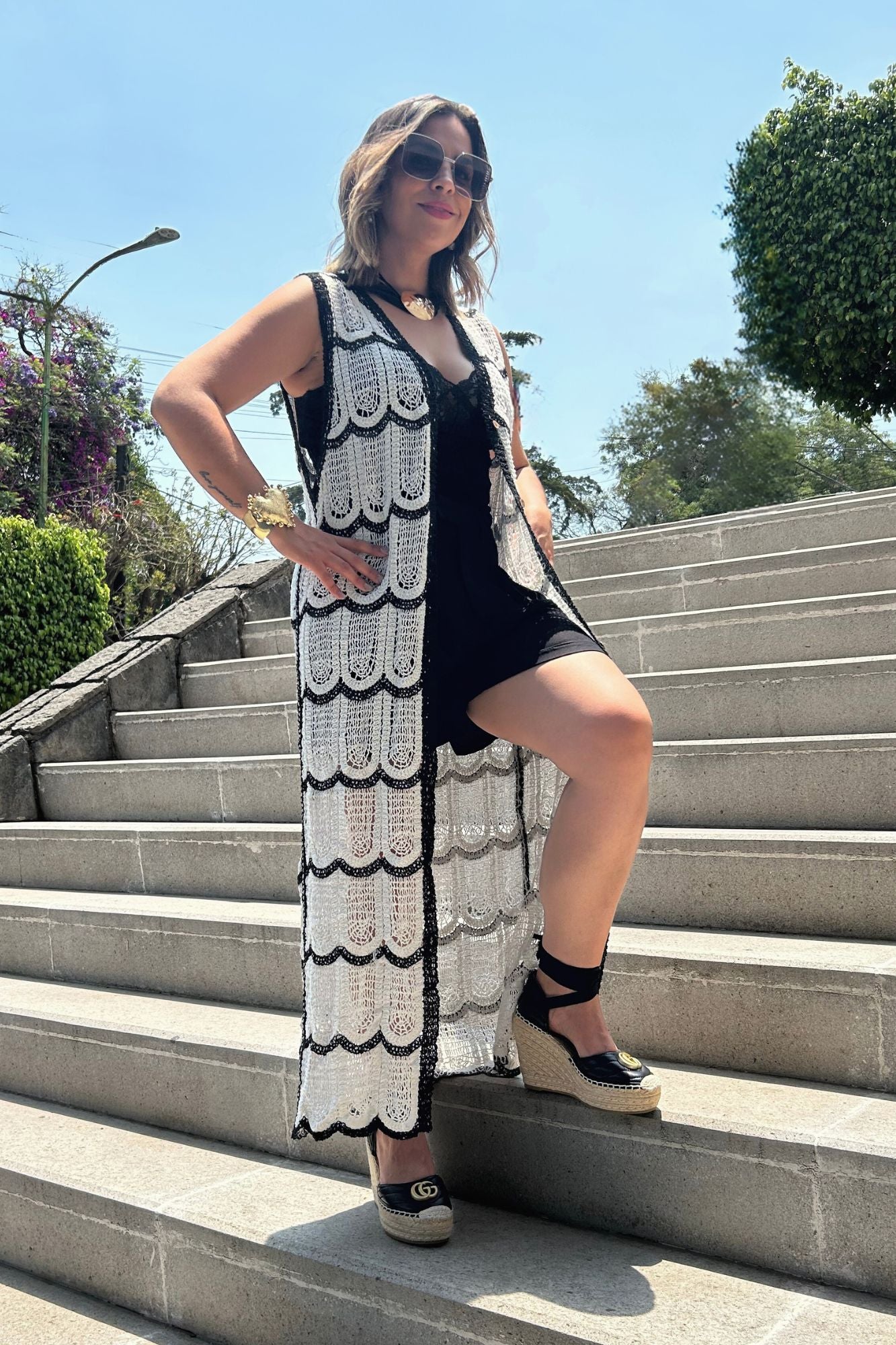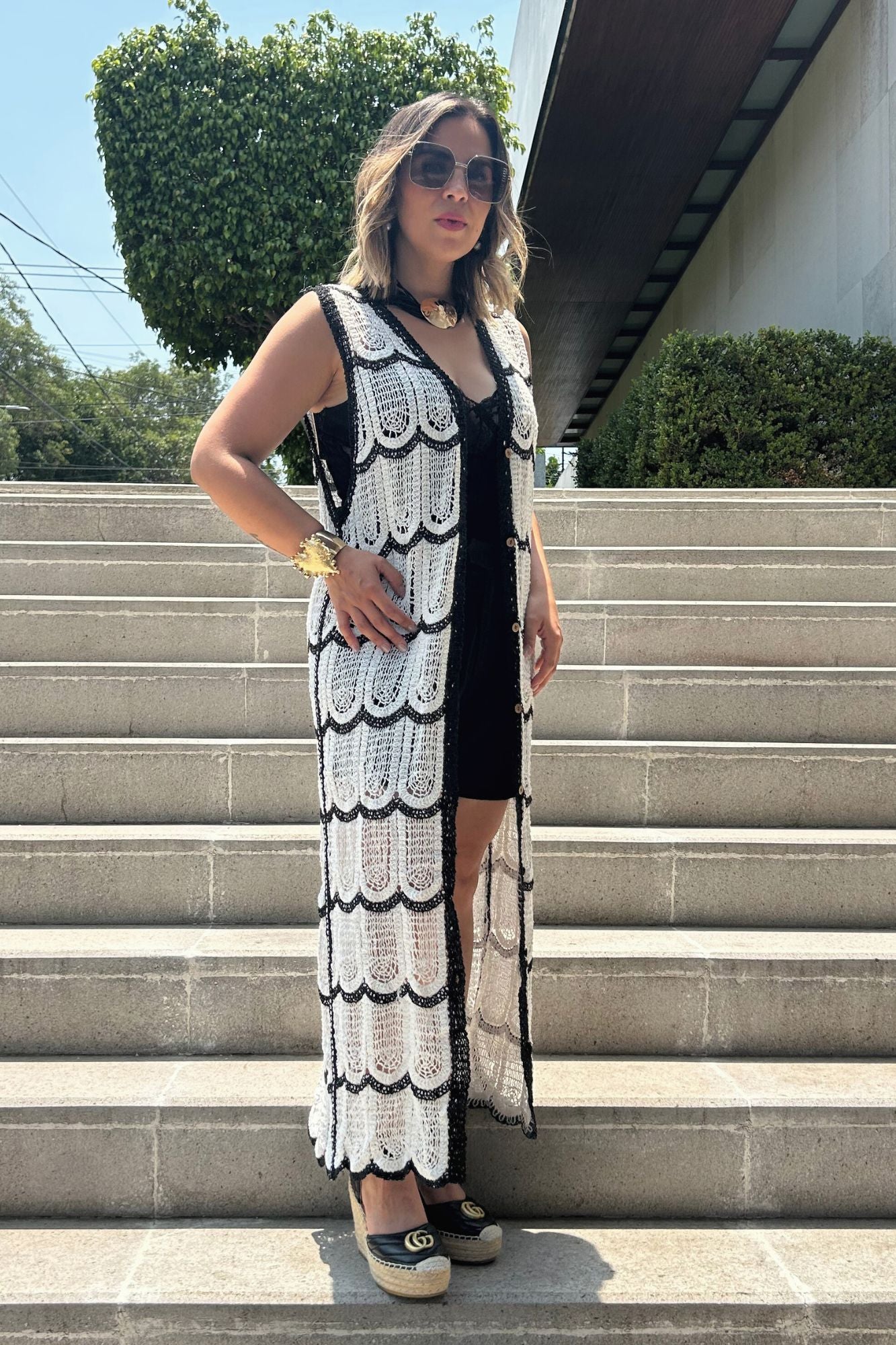 Ensamble tejido en crochet largo , con botones al frente sin mangas tipo cárdigan bicolor.