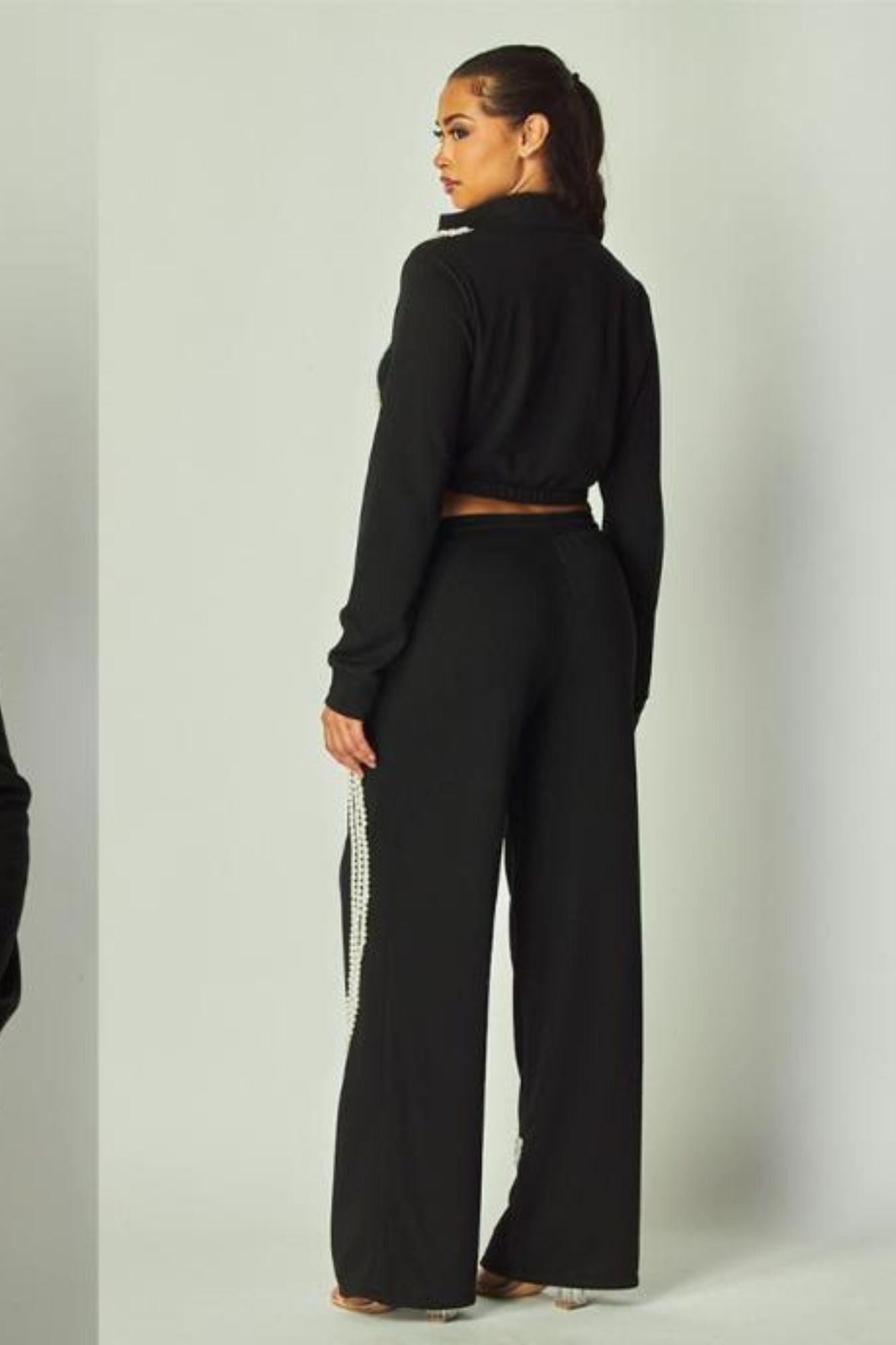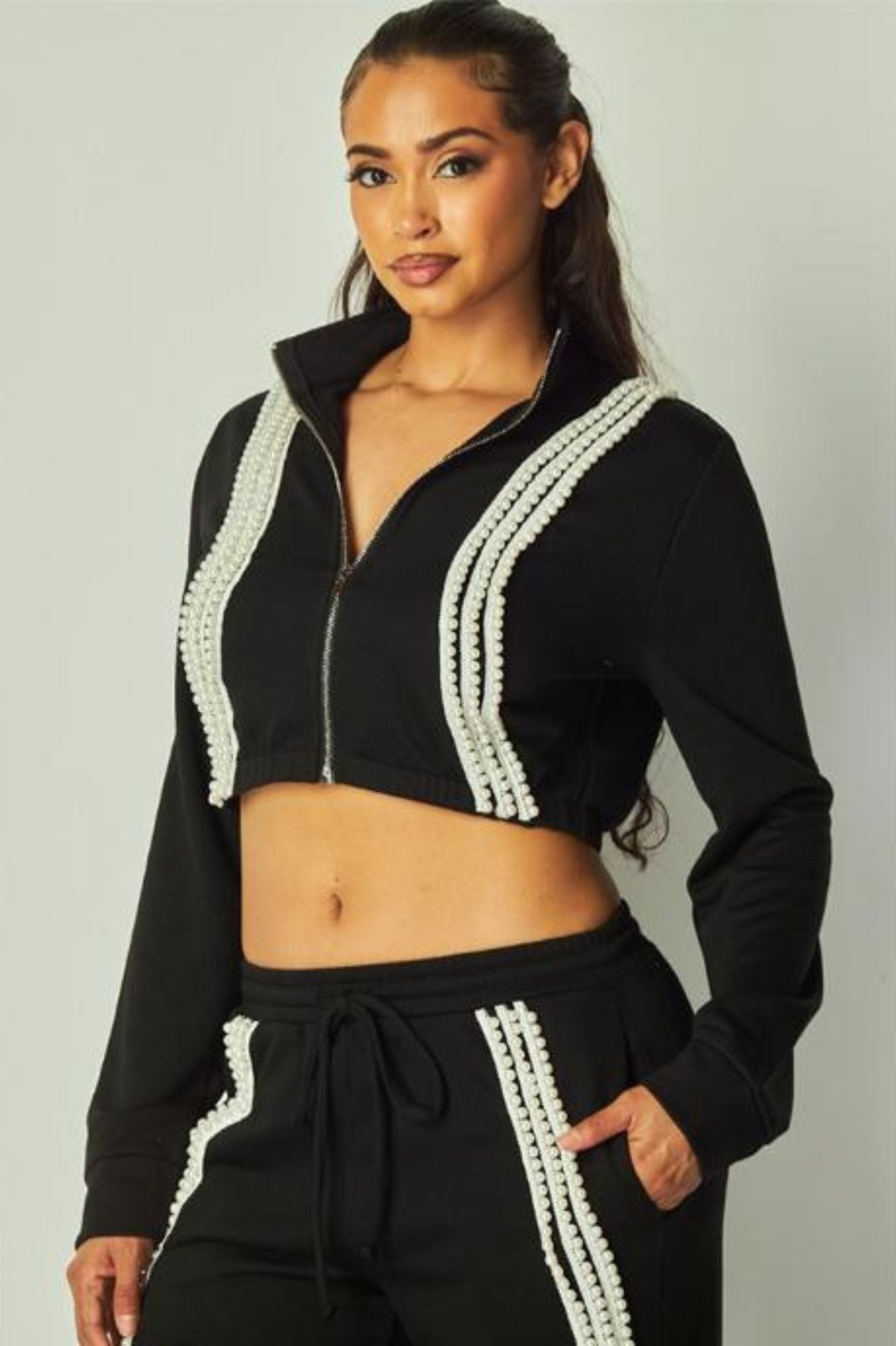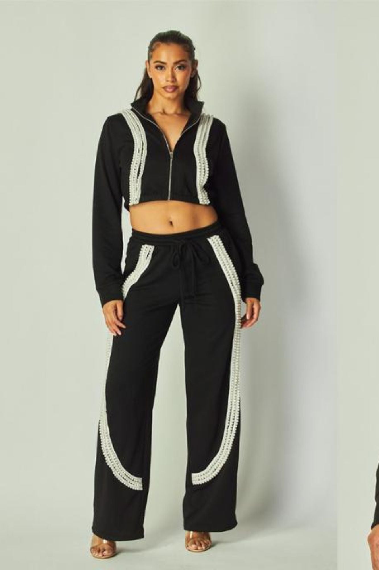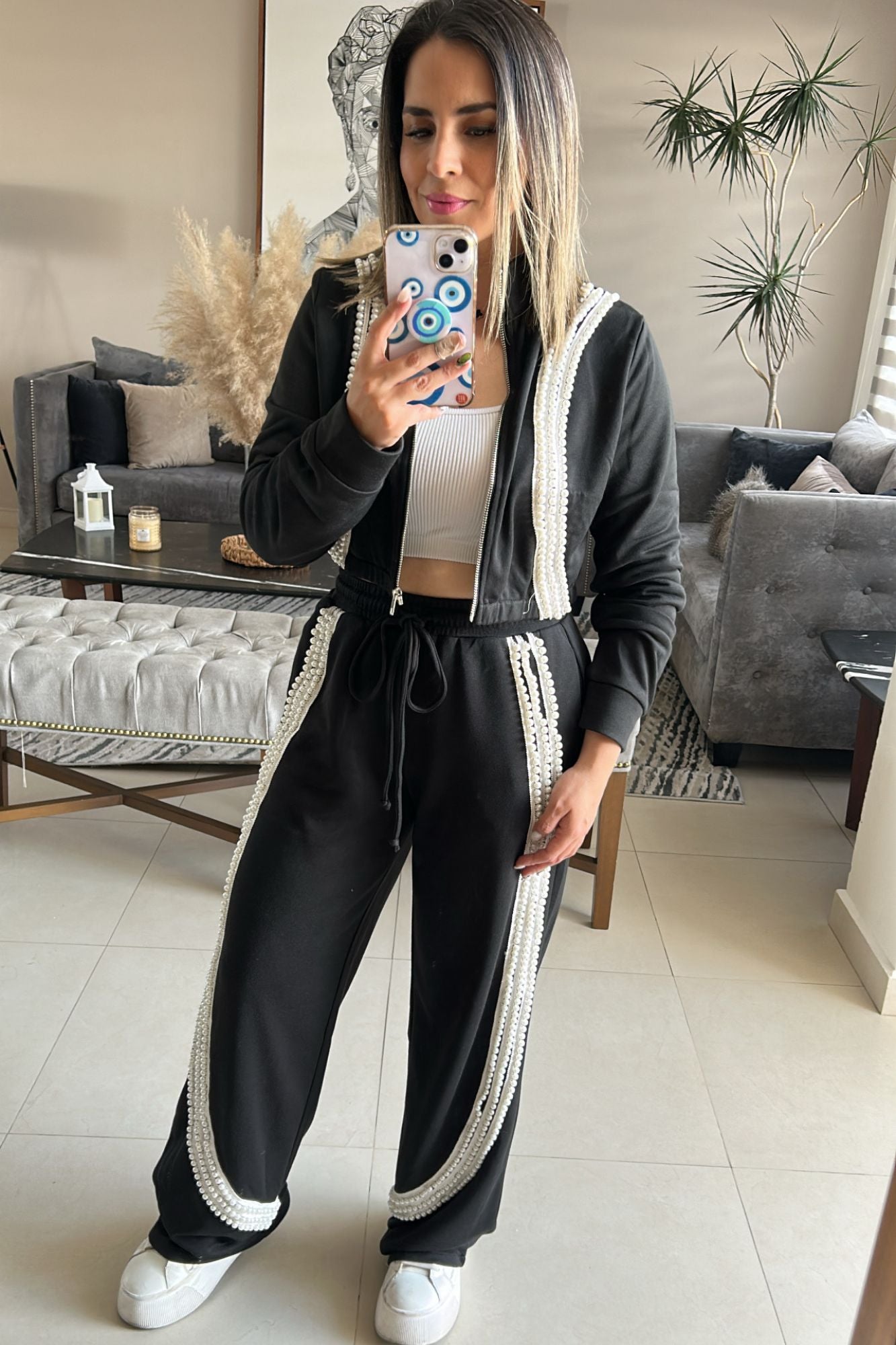 Set de pants negro con detalle perlas, pantalón con elástico en cintura con jareta en el tobillo, chamarra con cierre en la parte de enfrente.