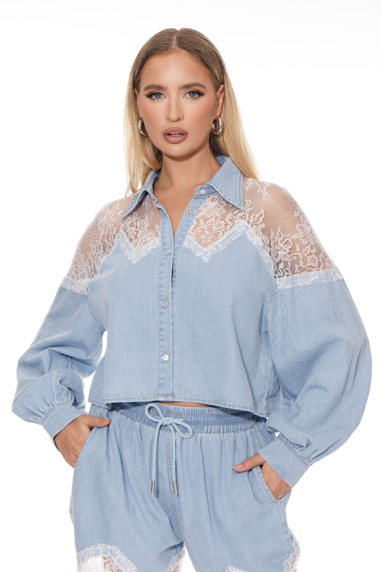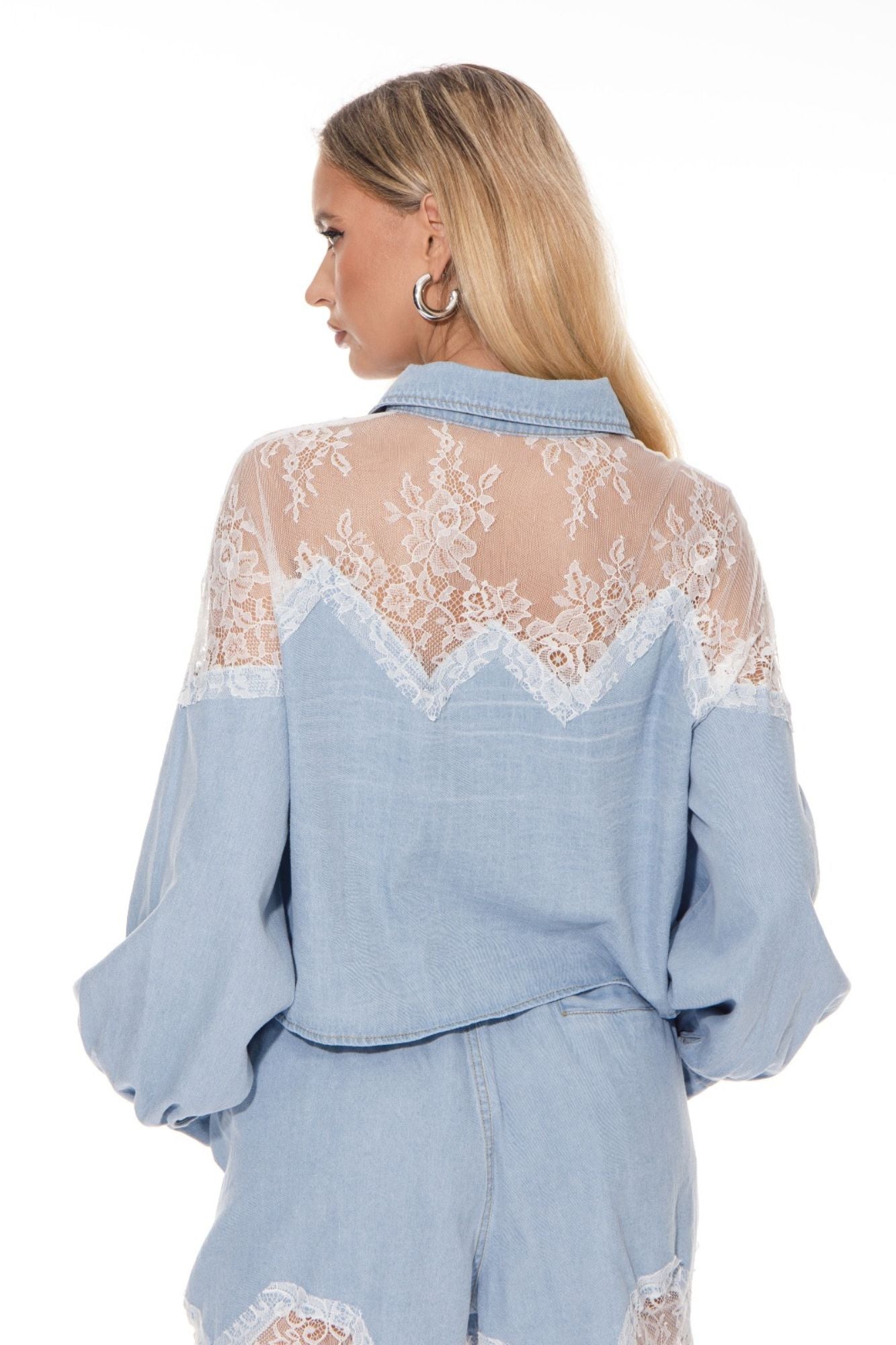 Set tipo denim de blusa ancha con encaje, manga larga y puños con elástico, y short con encaje y elástico en la cintura.