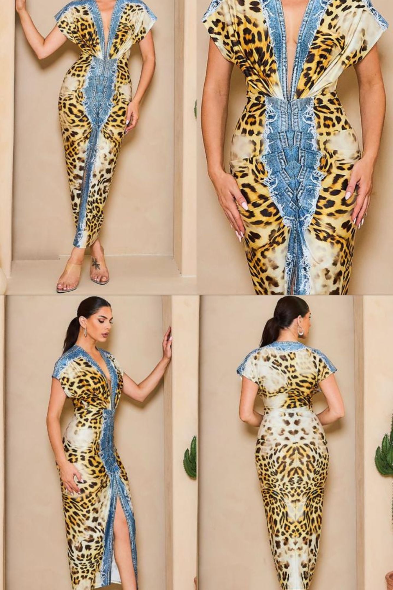 Vestido de licra plisado, ajustado al cuerpo con escote en v y con abertura enfrente.