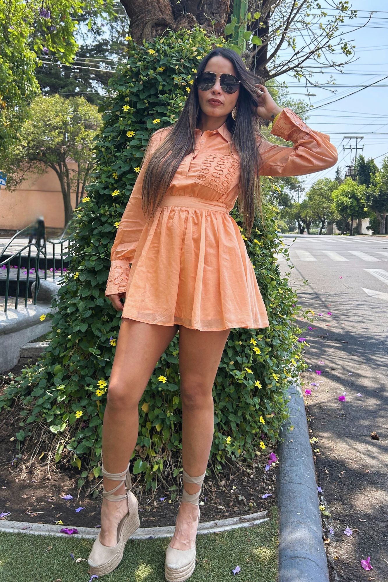 Vestido coral midi con ondas bordadas enfrente y en puños, con botones en la parte de enfrente y forro.