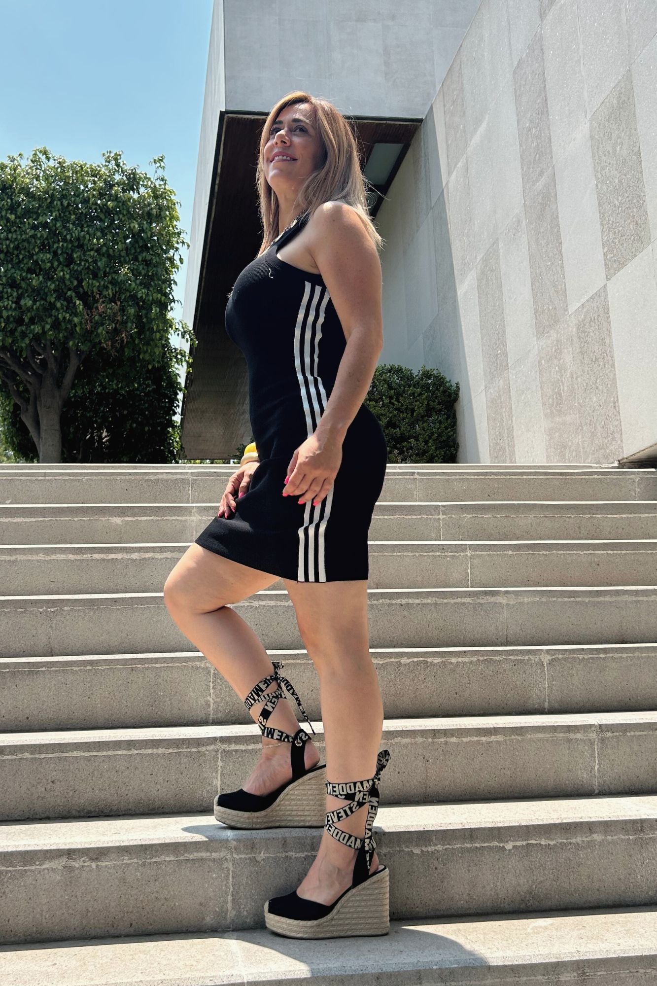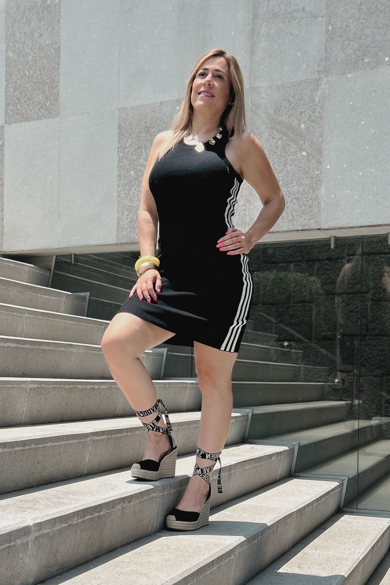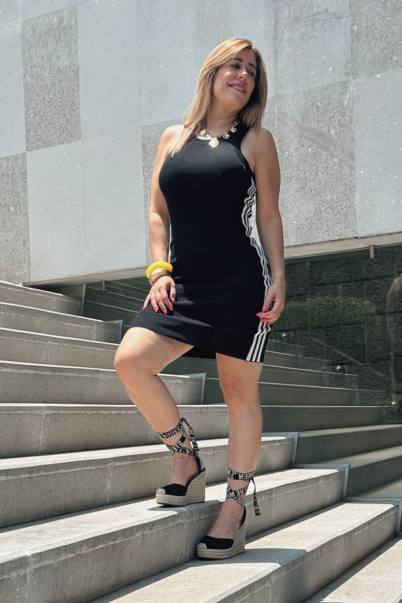 Vestido de punto corto, ajustado, sin mangas y con líneas track a los lados.